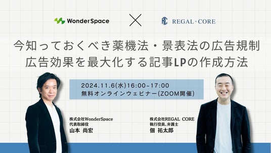 そこで今回、薬機法・景表法を中心とした広告審査サービスを提供する株式会社REGAL COREと、Webマーケティングの戦略構築をはじめとし、広告運用代行・記事LP制作などを幅広く手掛ける株式会社WonderSpaceが共催し、広告担当者が知っておくべき法改正や広告規制と広告効果を最大化する記事LPの作成方法について徹底解説いたします!