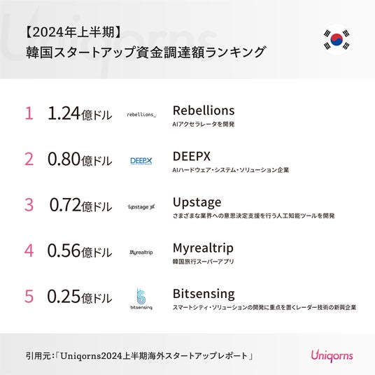 国内最大級のスタートアップメディア「Uniqorns(ユニコーンズ)」が2024年上半期の韓国スタートアップ資金調達状況をランキング形式で発表