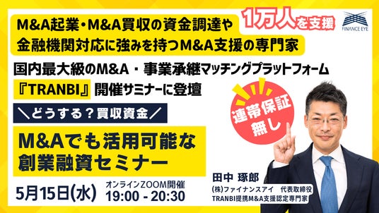 M&A・事業承継の資金調達と銀行対応に強いファイナンスアイが国内最大級の事業承継・M&AプラットフォームTRANBI(トランビ)にて【どうする?買収資金。M&Aでも活用可能な創業融資セミナー】を開催