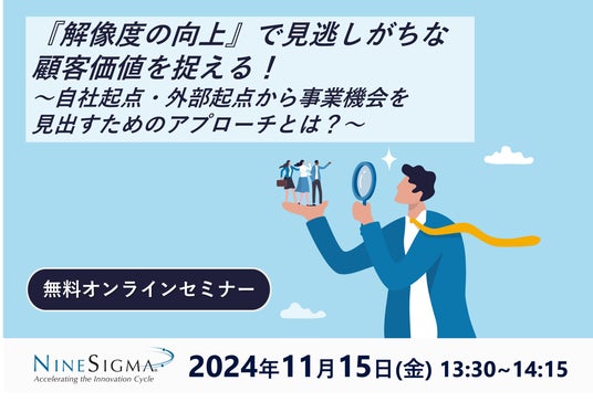 ナインシグマ・ホールディングス株式会社(本社:東京都千代田区、代表取締役社長:諏訪 暁彦、以下「ナインシグマ」)は、企業のR&D部門等に伴走し、各社が持つ「技術」の力を引き出す新規事業・研究開発テーマの創出から実行までのイノベーション活動支援を、世界850社以上・国内280社以上に提供しています。この度、事業機会創出において企業が顧客価値を見逃さないための手法である「解像度の向上」をテーマとした無料オンラインセミナー