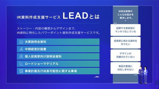 IR資料作成支援サービス 「LEAD」を運営する株式会社ストリームライン(所在地:東京都品川区 代表者:梶山洋二)は、サービス説明資料を刷新。サイト上で公開しました。
