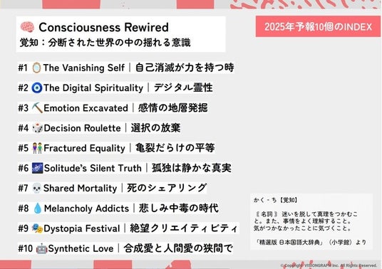「Consciousness Rewired|覚知:分断された世界の中の揺れる意識」 をテーマに、2025年の私たちの意識がどのように変化し、社会と個人がどのように向き合うのか、10の未来予報(R)を提案します。世界が分断と対立に揺れる中、未来予報(R)を通じて、新たな視点や選択肢に気づく機会としていただければ幸いです。