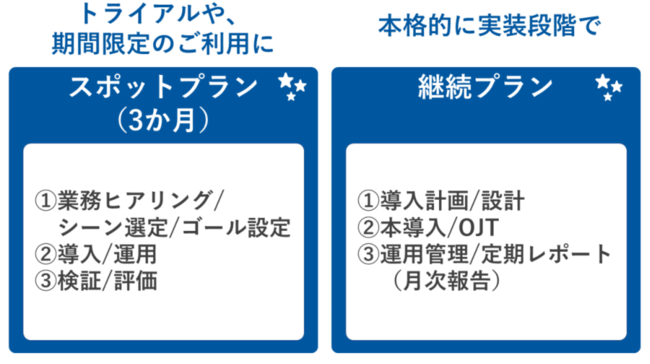 業務調査、要件定義、業務プロセス設計、システム提供、対話シナリオ作成、テスト/公開、運用ルール整備、マテリアル整備、公開後運用など。