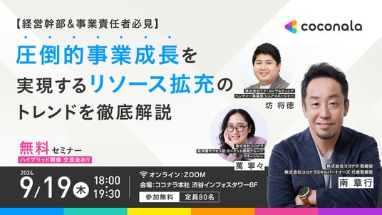 日本最大級のスキルマーケット「ココナラスキルマーケット」をはじめ、メディア「ココナラ法律相談」、4つのエージェントサービスを運営するを運営する株式会社ココナラ(本社:東京都渋谷区、代表取締役社長CEO:鈴木 歩)は、9月19日(木)18:00より無料セミナー「圧倒的事業成長を実現するリソース拡充のトレンドを徹底解説」を開催します。本セミナーはオフライン会場(ココナラ本社)とオンラインのハイブリッド開催となります。
