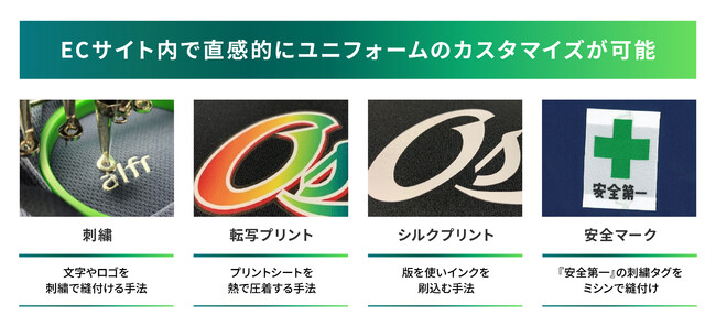 ・ユニフォーム販売における複雑なオーダーにも対応可能。(刺繍・プリントの位置、配色、文字などの複雑なカスタマイズも、直感的な操作で簡単に設定ができます。)