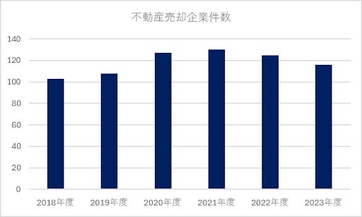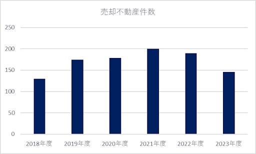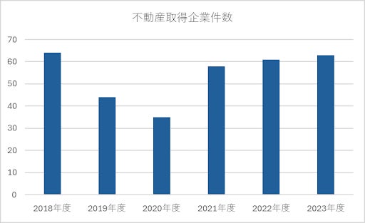 不動産取得は売却と反比例の関係で推移しており、2019年度・2020年度において一時停滞が見られておりました。しかし2021年度からは復調の傾向が見られ、2023年度においては年間の不動産取得件数が過去最高の61件を記録する結果となりました。