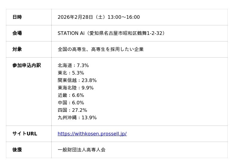 高専生を対象にしたキャリアパートナー事業を展開する株式会社プロッセル(本社:新潟県新潟市、代表取締役CEO:横山和輝、以下「プロッセル」)は、2026年2月28日(土)に高専生限定の就活イベント『With KOSEN進路研究セミナーin名古屋』を開催いたしました。本イベントは、KOSENJIN SUMMIT 2026のプラチナスポンサーとしてイベントを盛り上げるべく、前夜祭として開催しました。当日は全国から多数の高専生が名古屋に集結し、高専生を積極的に採用している企業との交流が図られました。