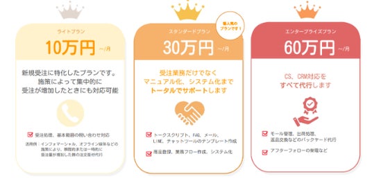 スポット的な受注増におすすめなライトプランから、マニュアル化やシステム化までトータルでサポートするスタンダードプラン、CS、CRM対応まですべて代行可能なエンタープライズプランまで、ご用意しております!