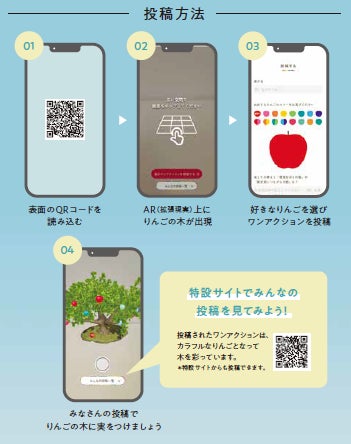 QRコードを読み込むと、AR(拡張現実)で立体的なりんごの木が映し出され、自分にできる脱炭素社会につながる行動=ワンアクション宣言を投稿すると、木にりんごがひとつ実ります。なお、1投稿につき50円を信濃毎日新聞社が脱炭素社会実現への活動資金として寄付します。