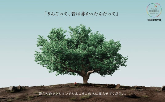 22日に発行するラッピング紙面に掲載される1本の大きな木。AR(拡張現実)を使って立体的に見ることができ、脱炭素アクションを投稿すると、その内容がりんごに変わり、木に実ります。同日に公開する特設サイトからも投稿が可能。連動して、東京都内や松本市内で信州りんごの販売会も行います。この木は1月28日の紙面にも再登場。ARで見ると、期間中にみなさんから投稿いただいたワンアクションがりんごとなり、たくさん実っている様子を見ることができます。