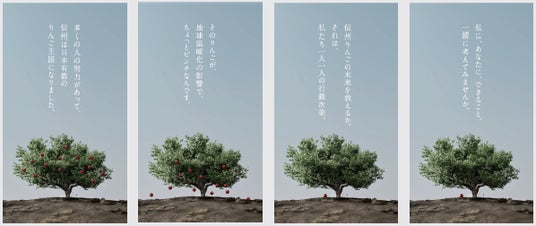 信州りんごを取り巻く環境問題や脱炭素社会実現の重要性、信州りんご150年の歴史などをまとめた特集記事を掲載します。特集中に11月22日に登場した木を再び掲載。QRコードを読み込むと、寄せられたワンアクション宣言がカラフルなりんごの実としてたくさん実っている様子をARで見ることができます。