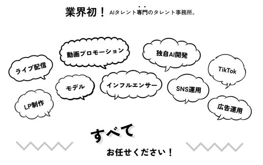 https://ai-talent-agency.com/※当社は、2023年3月に設立された業界初のAIタレント専門事務所です。AIタレントという概念自体が新しかった時期に、当社は先駆けてこの分野に特化したサービスを開始しました。設立前の2023年3月時点で実施した自社調査(主要検索エンジンを用いたWeb調査)では、国内に同様の専門事務所は存在しておらず、当社が業界初であることを確認しています。