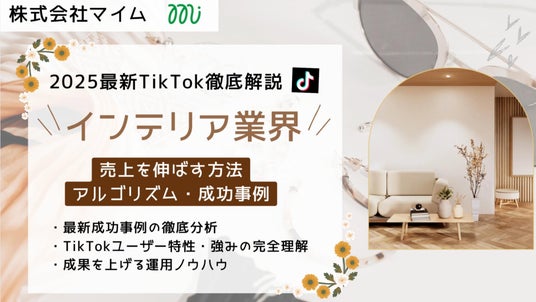 株式会社マイム(本社:東京都品川区、代表取締役社長:古川 湧一、以下「当社」)は、インテリア業界の皆様を対象に「2025年版TikTokトレンドレポート」を公開いたしました。本レポートは、TikTokを活用した最先端のプロモーション事例や成功パターン、そして結果に直結する戦略的な運用ノウハウを一冊に集約。