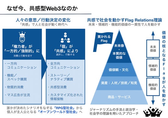 しかし、インターネットとSNS、そしてWeb3の登場によって、社会は大きく変化しました。まず、発信の主体が、権力者からあらゆる個人に変わりました。その結果として、発信が一部の権力者に限定されていた時代が終焉しました。もはやコミュニケーションは、双方向ですらなく、全方向に展開されるように変化しています。コミュニケーションの内容も、権力者から大衆に対して一方的に価値観を提示し行動を促す時代から、「個人」が「共感」により、選択し、行動する時代が到来したのです。