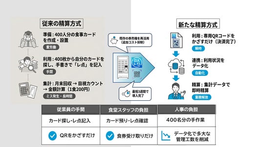 2. 食堂スタッフの業務負担:従業員からカードを預かり、レ点を確認する作業が都度発生。また、外部利用者に関しては現金精算業務が必要。