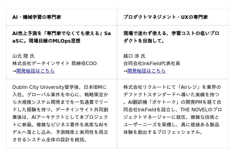 「THE NOVEL」は、売上予測AIを皮切りに、今後は経営企画、店舗開発、マーケティングなど多岐にわたる部門の課題解決に貢献する機能拡充を予定しています。