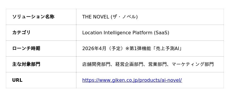 エリアマーケティングGIS(地図情報システム)の国内リーディングカンパニーである技研商事インターナショナル株式会社(名古屋本社:愛知県名古屋市、東京本社:東京都新宿区、代表取締役:小嶌 智海、以下当社)は、全社的なエリアデータ活用とそのDXを推進するLocation Intelligence Platform「THE NOVEL」(ザ・ノベル、以下NOVEL)の提供を、2026年4月(予定)に開始します。