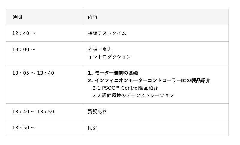 モーター制御について初心者の方/経験のある方ともに、モーターの基礎や制御方式、コントローラーの役割および、インフィニオンのモーターコントローラーICのラインアップや評価環境に関する理解度向上を目指します。