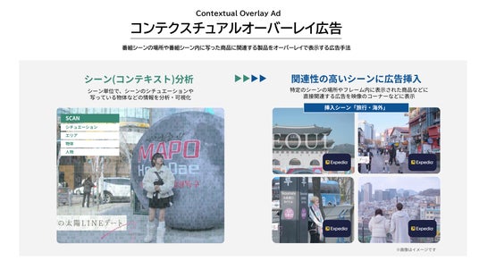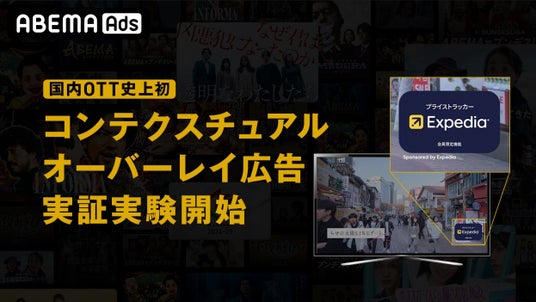 今回の実証実験における最初の広告主として総合旅行サイト「エクスペディア」が参加しており、当該番組の関連性の高いシーンにオーバーレイ広告が登場する予定です。