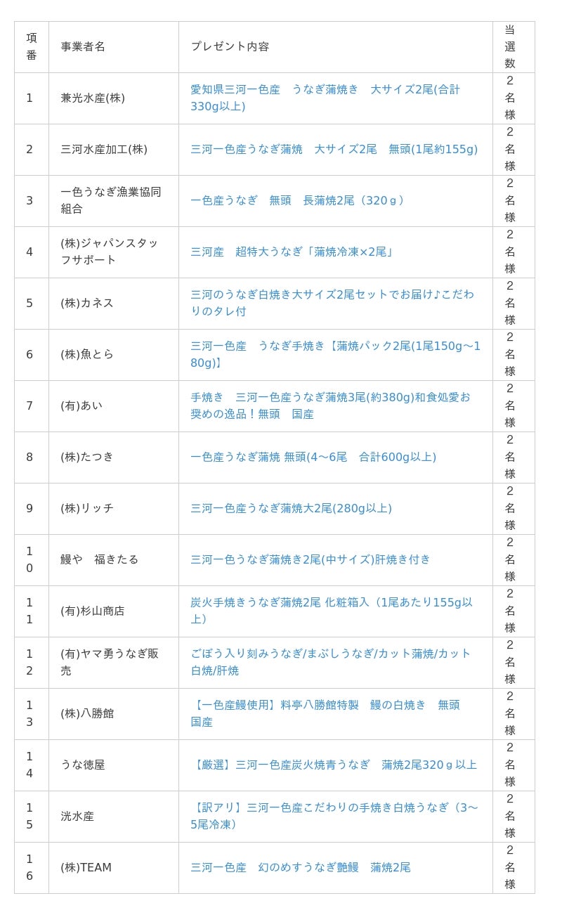 本キャンペーンでは、西尾市のふるさと納税返礼品提供事業者16者のご協力のもと、抽選で合計32名様に西尾市自慢のうなぎをプレゼント。