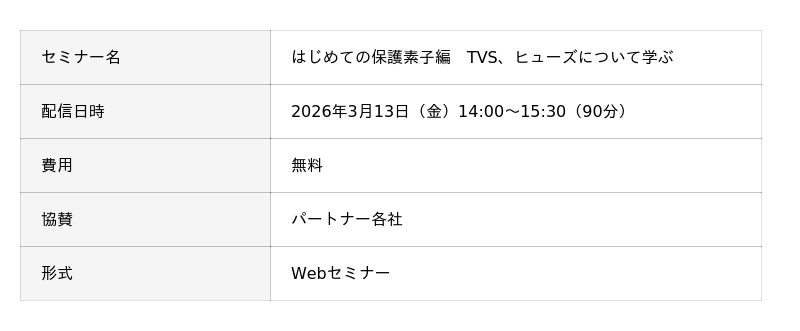 エレクトロニクス商社の丸文株式会社(代表取締役社長 兼 CEO / COO︓堀越裕史、本社: 東京都中央区、以下、丸文)は、3月13日(金)にTVS、ヒューズをテーマとして解説する無料のオンラインセミナーを開催します。