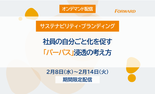 企業のブランド戦略を支援する株式会社フォワード(本社:東京都中央区、代表取締役:伊佐 陽介)は、無料セミナー「社員の自分ごと化を促す『パーパス』浸透の考え方」のオンデマンド配信を実施致します。2023年2月8日(水)~14日(火)の期間限定配信となっております。
