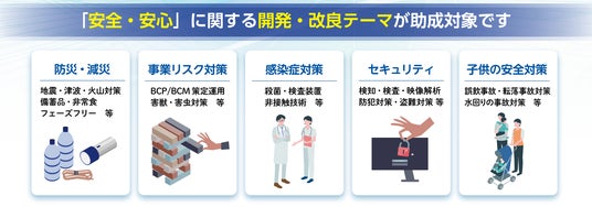 防災・減災をはじめ、子どもの安全対策、事業リスク対策、セキュリティ対策など、多様な「安全・安心」をテーマとする事業の申請を受け付けます。また、「開発・改良」から「普及促進」までの2つのフェーズを一貫支援しており、幅広い経費を助成対象とすることができます。