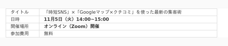 11月5日(火)14:00より、「時短SNS」×「Googleマップ×クチコミ」を使った最新の集客術オンラインセミナー(無料)を開催いたします。
