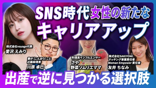 SNS時代において、新しいキャリアを生み出す女性が次々に生まれてきています。SNSを起点にまさに新たなキャリアを作りだしている、総フォロワー200万人を持ち元キャバ嬢で起業家の<愛沢えみりさん>、各方面で大活躍されている【こんまり】こと近藤麻理恵の夫であり、42ヶ国1400万部の著作をマネジメントしてきた<川原卓巳さん>、育休中に社会からの疎外感からSNSをスタートさせ、3ヶ月で34万人フォロワーを得た料理系ママインフルエンサー<さや・野菜ソムリエママさん>、そして株式会社SAKIYOMIでWoman Empowerプロジェクトを推進する<友井 ちなみ>が登壇します。