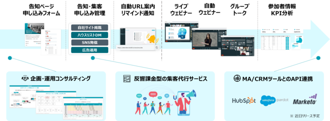 マーケティング利用に特化した独自開発の「ツール」だけでなく、立ち上げに必要な「企画・運用サポート」や「反響課金型の集客代行サービス」を提供することで、成果にコミットするウェビナーマーケティグを実現致します。