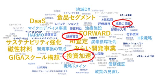 「投資加速」「成長力強化」「設備管理」といった投資系ワードが出現数でトップとなりました。