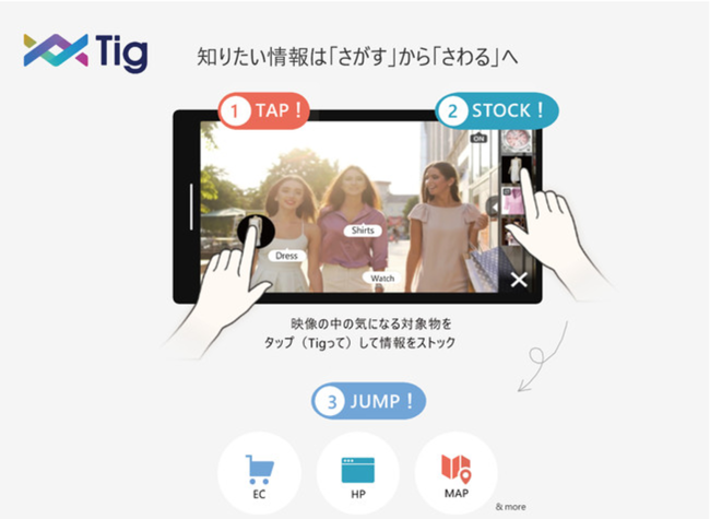 一方パロニム社は、インタラクティブ動画技術「Tig(ティグ)」の開発・提供をおこなっており、地方自治体のインバウンド施策にも活用されています。「Tig」は、映像内に出てくる情報<モノ・ヒト・コト・音・場所>などを、画面上からタップ(クリック)するだけで様々な情報を得ることができるインタラクティブ動画テクノロジーです。動画視聴中に観光スポットや店舗・地図・商品・クーポンなど気になったものに「さわる」だけで、直感的に情報をストック(取得)することができるため、検索リテラシーや言語依存による言葉の壁などの不便さを越えて 訪日観光客は“旅前” “旅中” の観光情報を入手することが可能です。さらに、ユーザーのタップ・ストック・ジャンプ等の視聴行動データが計測できるため、訪日観光客の興味関心を細かく分析することができるようになり、自治体は今後の訪日観光客誘致に向けた効果的なプロモーションに繋げることが可能です。