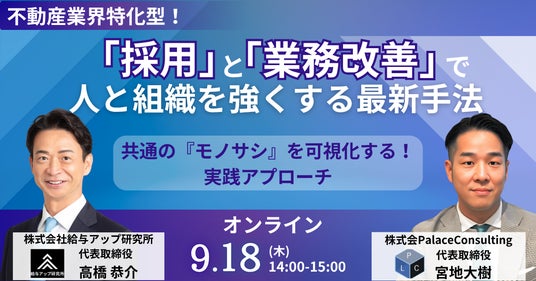 株式会社給与アップ研究所(本社:東京都千代田区、代表取締役:高橋 恭介)は、株式会社Palace Consulting(本社:東京都品川区、代表取締役:宮地 大樹)と共催で、2025年9月18日(木)14:00より、不動産業界に特化した無料オンラインセミナー「採用と業務改善で人と組織を強くする最新手法」を開催します。