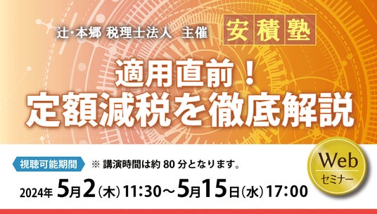 辻・本郷 税理士法人(本社:東京都新宿区、理事長:徳田孝司)は、2024年5月2日(木)より「【安積塾】適用直前! 定額減税を徹底解説」セミナーを開催いたします。令和6年度税制改正で可処分所得を伸ばすため導入された定額減税が令和6年6月より適用開始となります。定額減税は所得税と住民税で実施され、それぞれで計算方法が異なります。現時点(※)で、公表されている資料に基づき、定額減税の対応方法や適用開始直前に気になる重要ポイントを解説します。※2024年4月中旬時点