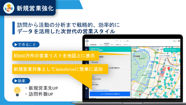 「UPWARD」と Salesforce の連携により、約800万件の営業リストを地図上に表示、新規営業対象としてSalesforceに追加することができます。