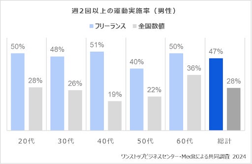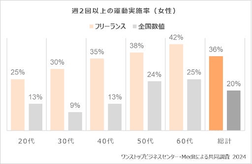 全国でバーチャルオフィス「ワンストップビジネスセンター」を展開し起業支援を行う、株式会社ワンストップビジネスセンター(取締役社長:生田泰啓、本社:東京都港区 以下「当社」)は、産業保健サービスの提供およびヘルスケア関連事業の企画・提案を行うMedit(代表:原田麻純、所在地:福岡県福岡市)と共同し、フリーランス約500人の健康実態調査を実施しました。 当調査からは、「体が資本」を体現するフリーランスの多くが自由な働き方を実現しながら、健康意識を高く保っている姿が浮き彫りとなりました。<調査の背景> 「令和4年就業構造基本調査」(総務省統計局)によると、フリーランスの規模は全有業者の3.1%におよび、本業をフリーランスとする者が209万人、副業がフリーランスである者を合わせると257万人と大きな存在感を示すようになりました。2023年4月のフリーランス新法制定の流れを受け、今年の11月には労災保険特別加入の対象拡大を控えるなど、フリーランスを巡る労働環境整備に注目が集まっています。一方で、フリーランスの労働衛生を考える上で不可欠な、フリーランスの健康実態を明らかにする大規模な調査は未だ充実しているとは言えません。以上の背景から、フリーランスの健康実態と労働との関連を明らかにすることを目的に調査を実施しました。