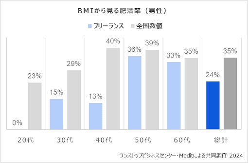 <調査結果>全国の統計と比較しフリーランスの肥満率が明らかに低いことが判明! 本調査での体重・身長の回答から、BMI※を算出。BMIから肥満率を算出したところ、20代から60代の年代ですべてが全国数値を下回りました。特に男性の肥満率が跳ね上がる40代では、全国の数値と比較し27ポイント下回りました。