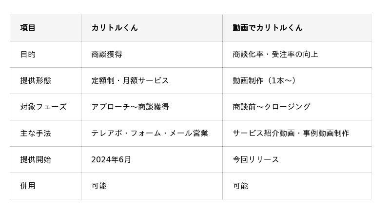 今回リリースする「動画でカリトルくん」は、既存の「カリトルくん」と並行して提供する新たなサービスであり、「商談獲得(カリトルくん)」と「商談化率・受注率の向上(動画でカリトルくん)」を組み合わせることで、営業プロセス全体を支援できる体制となります。