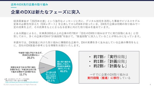 とある調査によると、従業員300名以上の企業の約7割が「自社のDX取り組みはすでに実行段階にある」と回答しており、多くの企業がDXの“計画段階”を抜けて、“推進段階”に突入していることが明らかになっています。