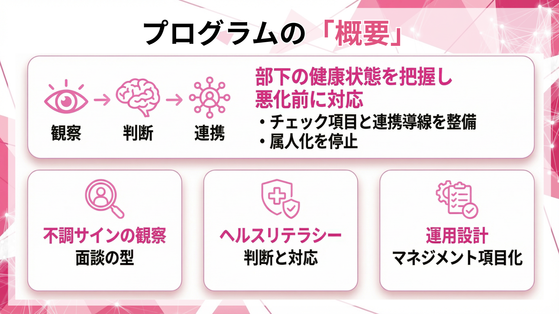 提供内容A. 不調サインを見抜く観察と面談の型を習得・行動・勤怠・成果の変化からストレスや体調悪化の兆候を把握する観点を整理