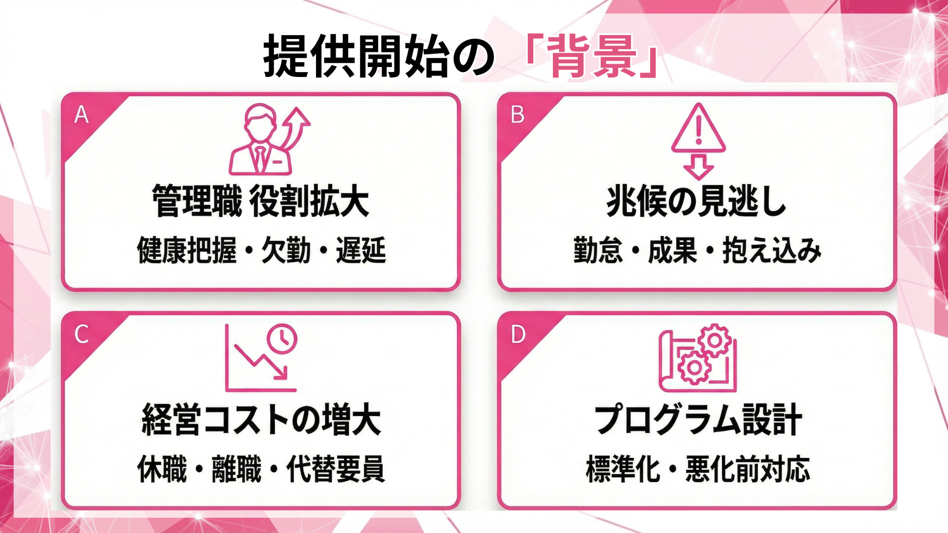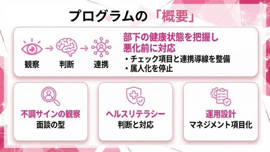結果として、業務停滞、代替要員の手配、再教育など、直接・間接コストが増大します。当社は、管理職のヘルスリテラシーを必須スキルとして標準化し、悪化前に手を打てる運用を組織に実装するため、本プログラムを提供開始します。