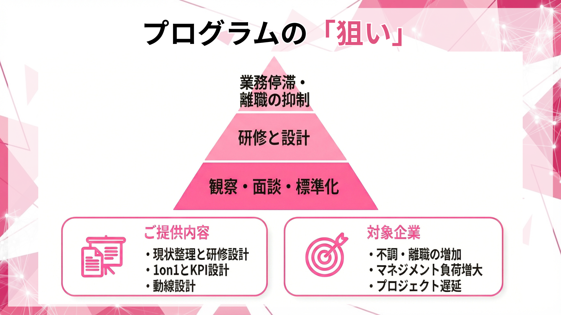4)KPIで効果検証し、運用改善が可能KPI例:欠勤日数、遅刻早退、残業偏り、プレゼンティーズム(自己申告でも可)、業務遅延件数、1on1実施率、相談件数、休職・離職率。企業課題に合わせて設計します。
