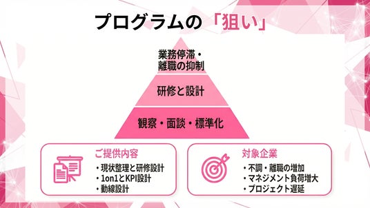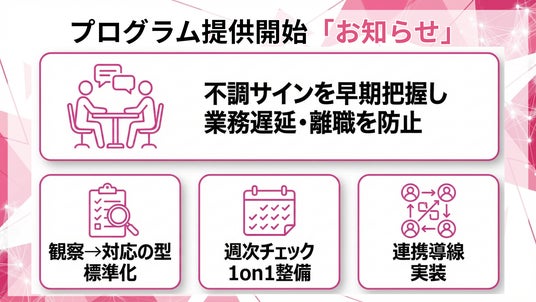 管理職が部下の不調サインを早期に捉え、業務遅延・品質低下・離職を防止する「管理職 健康マネジメント研修・実装支援」の提供を開始しました。本支援は、管理職が実務で使える「観察→確認→判断→対応→連携」の型を標準化し、健康をマネジメント項目に組み込む運用(週次・月次のチェック、1on1テンプレ、面談記録、産業保健・人事への連携導線)まで整備します。
