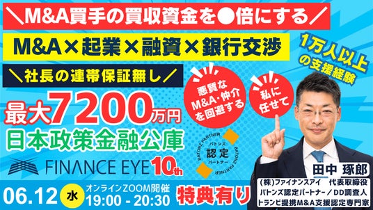 2024年6月12日(水)19:00より、オンラインでZOOMを使用して実施されます。コロナ禍を乗り越え、億超えの起業家を生み出し続けたファイナンスアイが、良い案件も悪い案件も1万人以上をリアルに支援したから分かる融資審査の本音と建前、M&Aのオカネとリスクの解決策を分かりやすく伝えます。