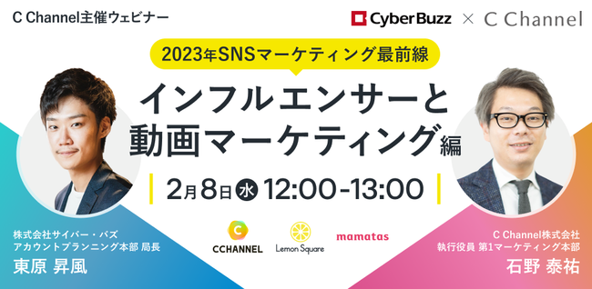 ソーシャルメディアマーケティング事業を展開する株式会社サイバー・バズ(本社:東京都渋谷区、代表取締役社長:高村彰典)は、C Channel株式会社(本社:東京都港区、代表取締役社長:森川 亮)とともに無料オンラインセミナー「2023年SNSマーケティング最前線 ~インフルエンサーと動画マーケティング編~」を2月8日(水)12:00より開催いたします。