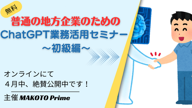 株式会社MAKOTO Primeは、地方企業向けに『ChatGPT業務活用セミナー ~初級編~』をオンラインで開催することを発表しました。このセミナーは、ChatGPTを日々の仕事の中でどう活かせば良いのか、イメージが掴めていない方のために、具体的なデモンストレーションを含めて活用方法をお伝えします。当社では地方課題を解決するためには、このAI活用の流れに地方が出遅れない事が重要と考えております。多くの方のお役に立てればとの想いから、個人参加の方々だけでなく、会社の社員教育代わりに本セミナーをご活用頂くことも歓迎しています。広く地方企業の社員の方々にChatGPTをご活用頂き、より良い地方を共に作ることができれば幸いです。