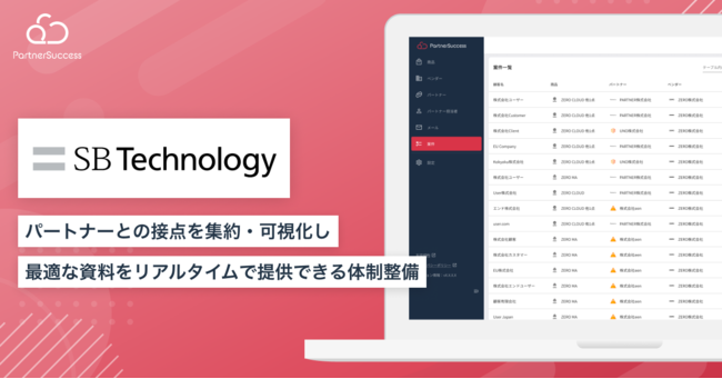 売れる代理店を増やすPRM(※1)-代理店連携管理クラウド「PartnerSuccess」を開発運営するパートナーサクセス株式会社(本社:東京都渋谷区、代表取締役 永田雅裕、以下「パートナーサクセス」)はSBテクノロジー株式会社(本社:東京都新宿区、代表取締役社長 CEO 阿多 親市、以下「SBテクノロジー」)に「PartnerSuccess」を導入頂きました。