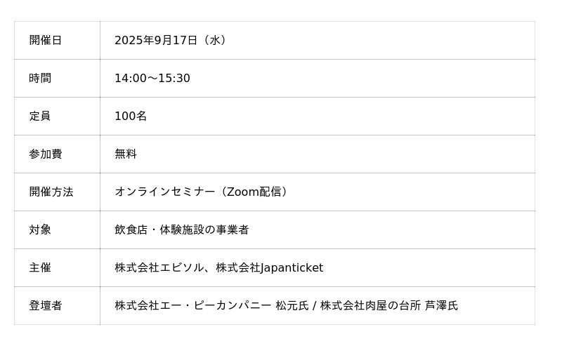 本セミナーでは、インバウンド集客支援を手がける株式会社Japanticketと、飲食店向け予約管理システム「ebica」を提供する株式会社エビソルが共催し、“認知 → 予約 → 自動化” の3ステップに分けて、今すぐ現場で活かせる成功パターンを実例ベースでご紹介!