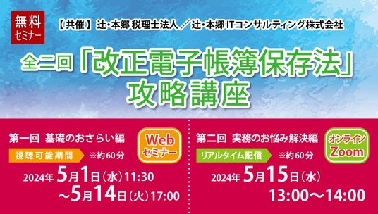 辻・本郷 税理士法人(本社:東京都新宿区、理事長:徳田孝司)は、辻・本郷 ITコンサルティング株式会社(本社:東京都渋谷区、代表取締役社長:黒仁田健)と2社共催で「全二回『改正電子帳簿保存法』攻略講座」を開催いたします。リクエストにお応えし、「改正電子帳簿保存法」について徹底的にガイドする全二回のセミナーです。第一回は、基礎がわかるおさらい編として、改正電子帳簿保存法の概要や各保存要件をわかりやすく解説します。第二回は、Zoomにてリアルタイムで質問にお答えします。すべての時間をQ&Aにあてていますので、実務の中で発生しているお悩みや不安の解消にお役立てください。