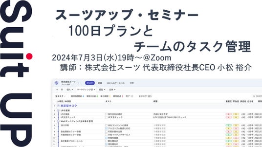 株式会社スーツ(所在地:東京都千代田区、代表取締役社長CEO:小松 裕介)は、2024年7月3日(水)19時から、当社代表の小松が講師を務めるスーツアップ・セミナー「100日プランとチームのタスク管理」を無料開催します。